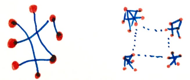 Global network (left) vs Local or clustered network (right). Global network effects create WTA markets; whereas local network effects are more likely to create WTM or Fragmented markets.